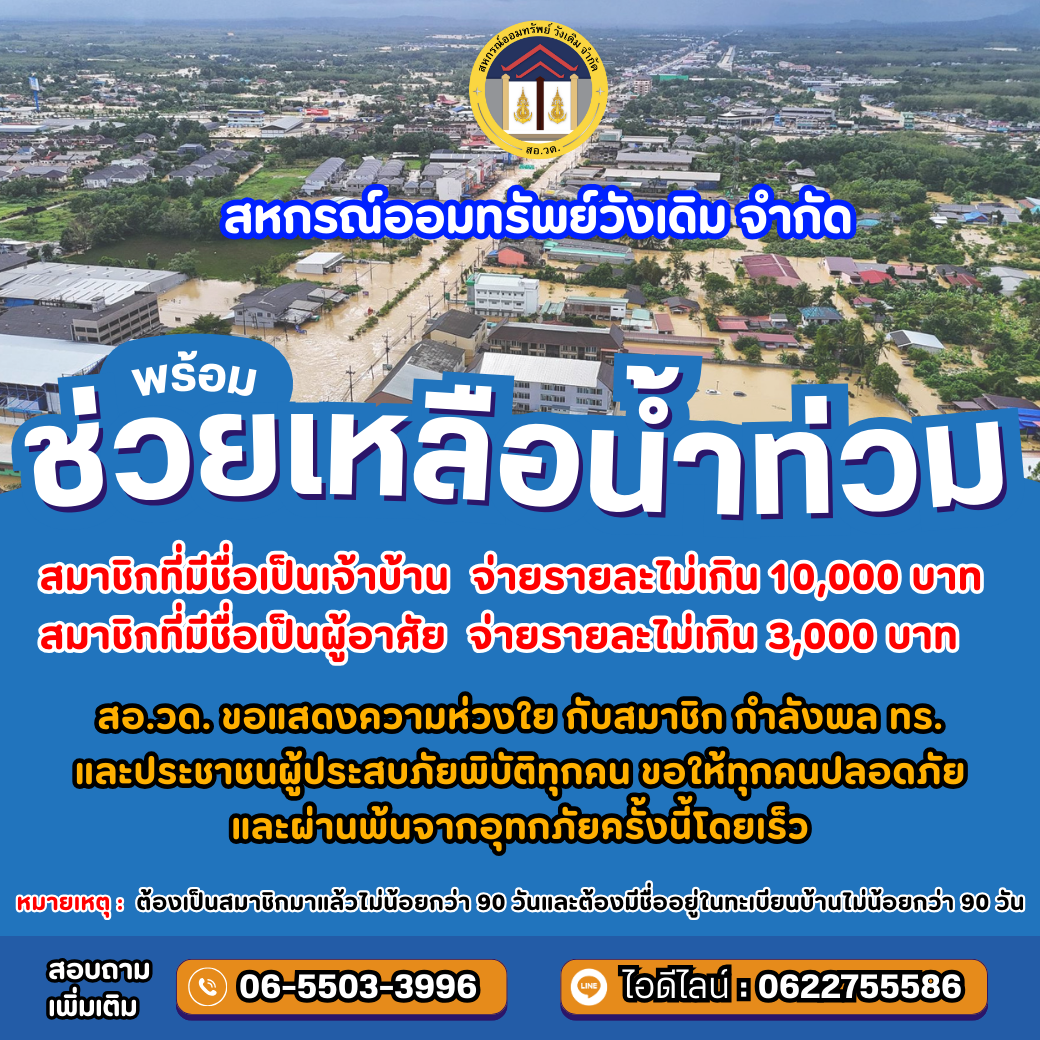 สหกรณ์ออมทรัพย์วังเดิม จำกัด พร้อมช่วยเหลือน้ำท่วม