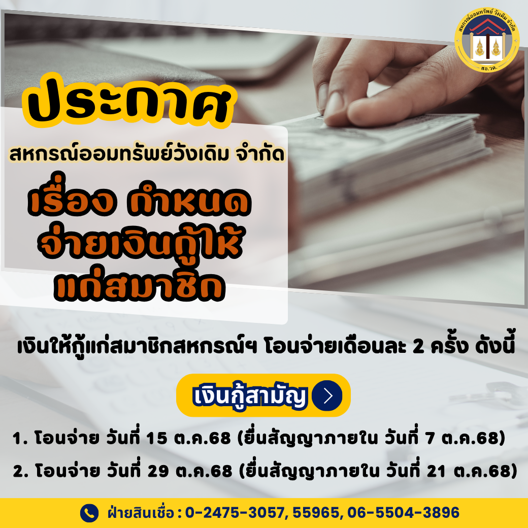 กำหนดจ่ายเงินกู้ ประจำเดือน ต.ค.68